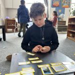 • Stamp Game: This versatile material supports all four operations—addition, subtraction, multiplication, and division.  It’s a set of small tiles or “stamps” representing units, tens, hundreds, and thousands.  The children use the Stamp Game to deepen their understanding of operations as they physically group, exchange, and move the stamps to solve equations. This hands-on approach helps them internalize concepts like carrying in addition and multiplication, and borrowing in subtraction. For division, children distribute tiles (representing units, tens, hundreds, or thousands) into equal groups, reinforcing the concept of sharing and remainders.