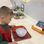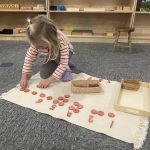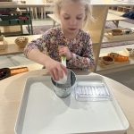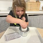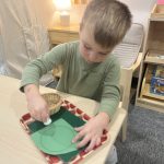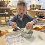 A favorite practical life activity this week was soap grating! The children carefully used graters to create soap flakes, developing their fine motor coordination and concentration while engaging multiple senses. The satisfying sound of the grater, the fresh scent of the soap, and the transformation of a solid bar into delicate flakes captivated the children. Some children grated for extended periods, demonstrating the deep concentration that emerges during purposeful work. These soap flakes will be used for future classroom activities, giving the children ownership over preparing materials for their community.