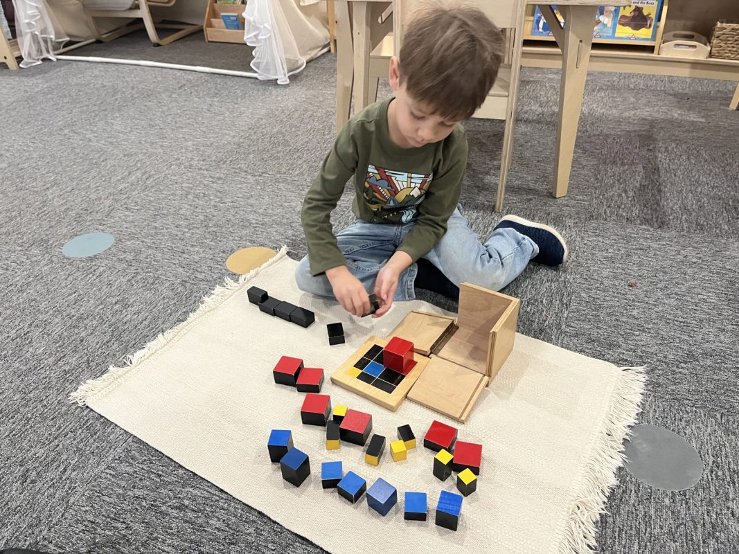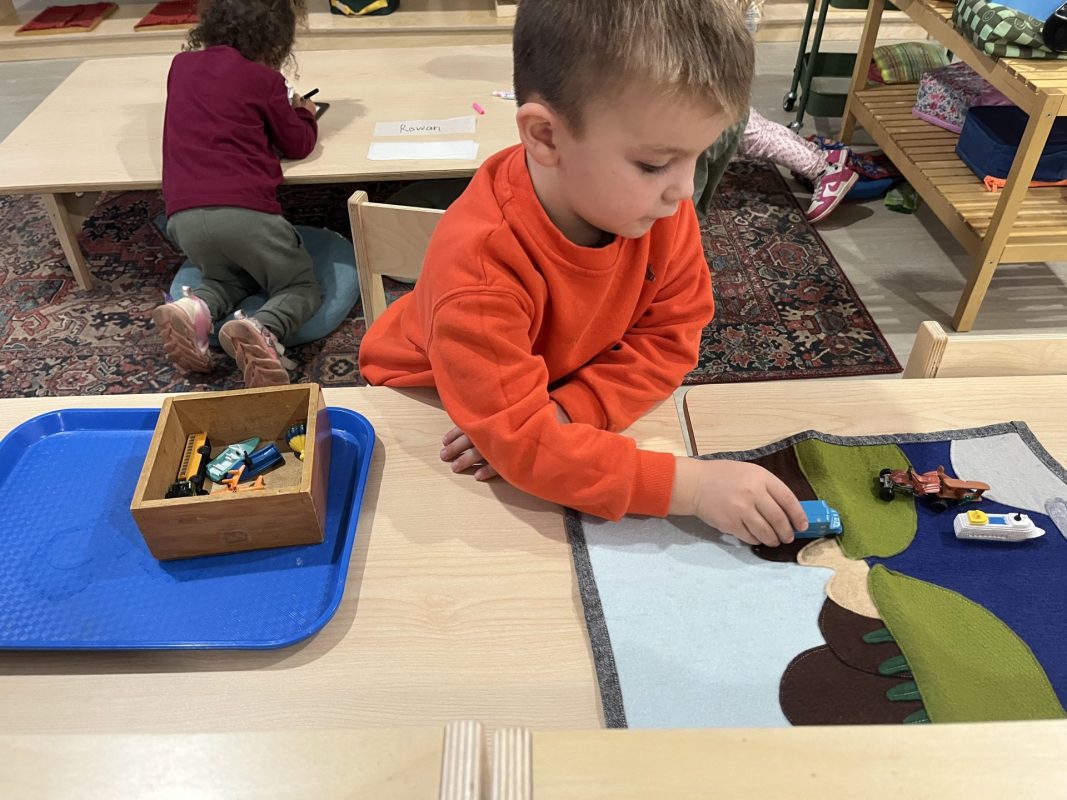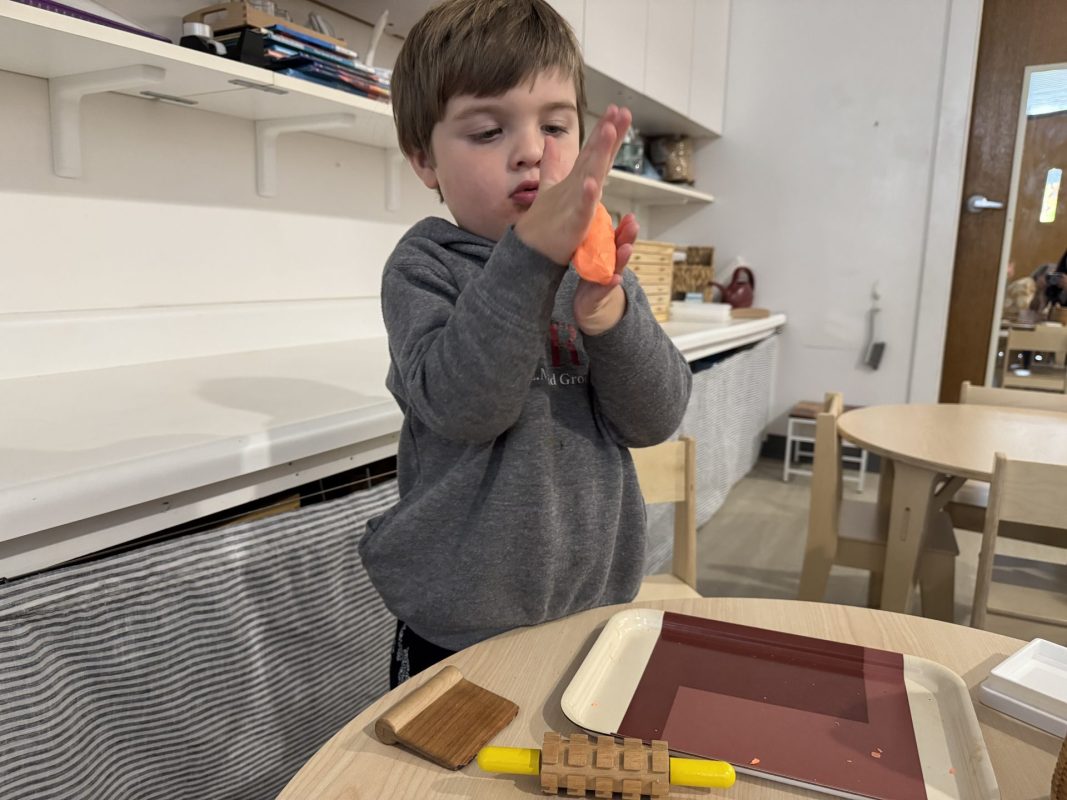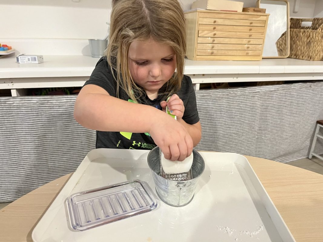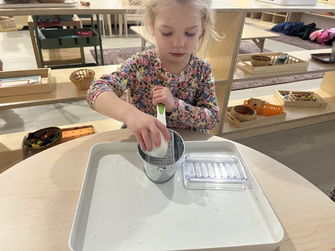 A favorite practical life activity this week was soap grating! The children carefully used graters to create soap flakes, developing their fine motor coordination and concentration while engaging multiple senses. The satisfying sound of the grater, the fresh scent of the soap, and the transformation of a solid bar into delicate flakes captivated the children. Some children grated for extended periods, demonstrating the deep concentration that emerges during purposeful work. These soap flakes will be used for future classroom activities, giving the children ownership over preparing materials for their community.