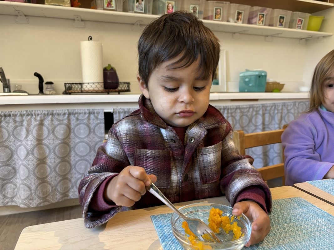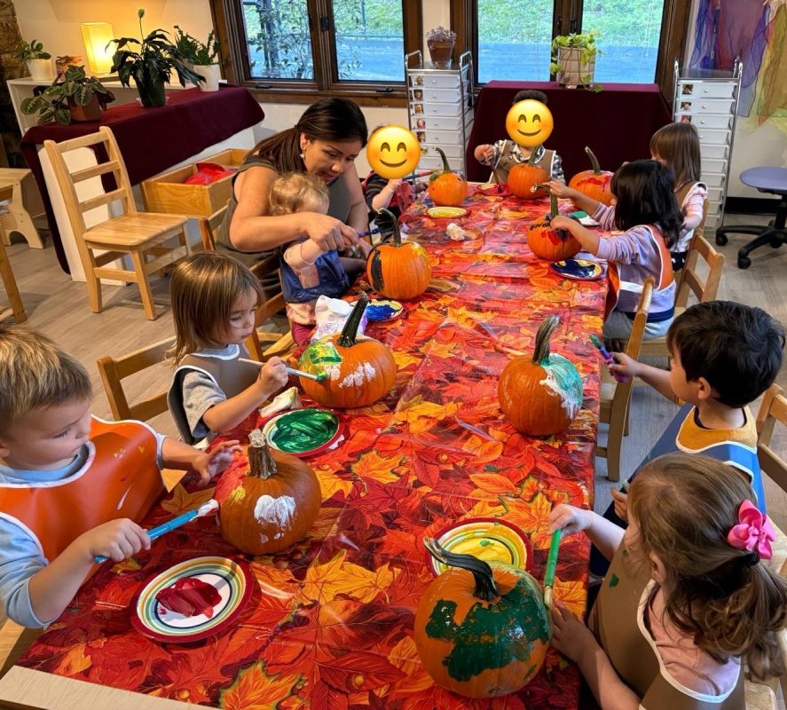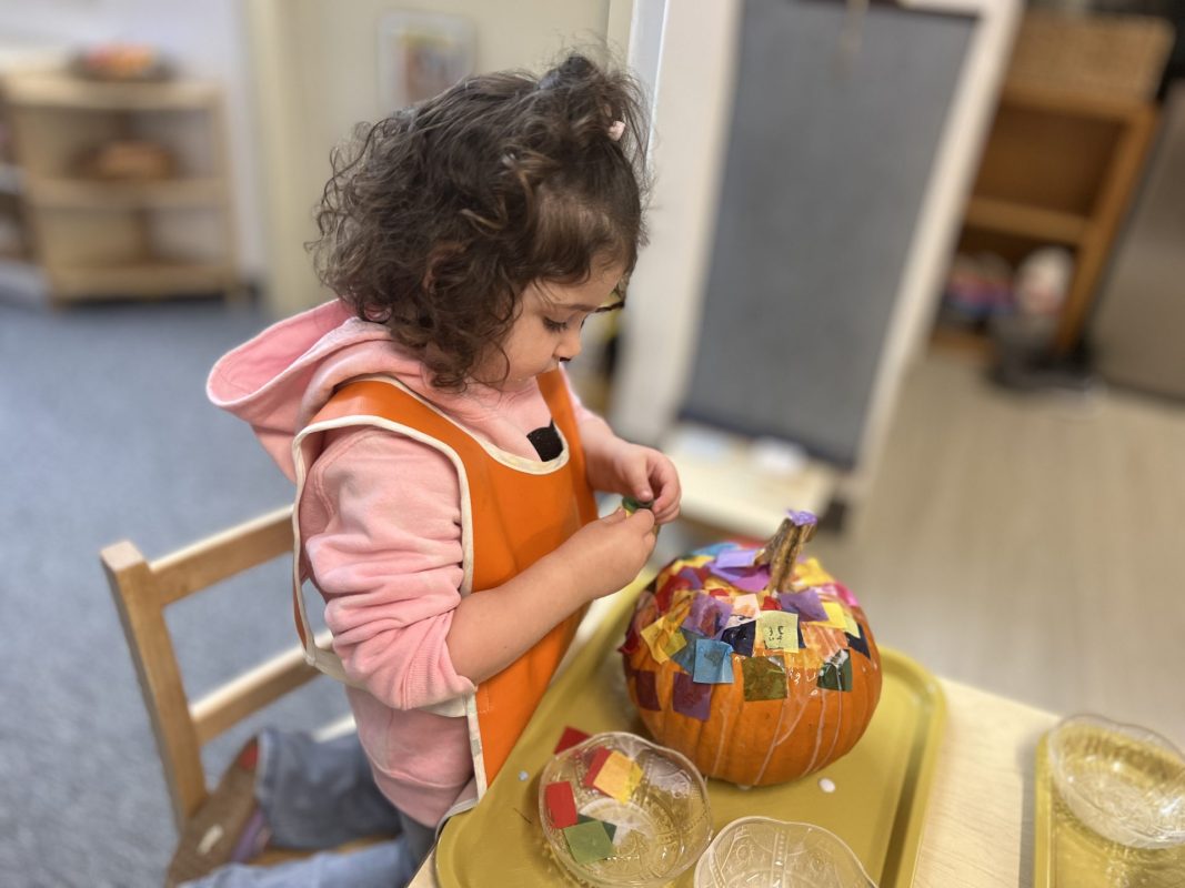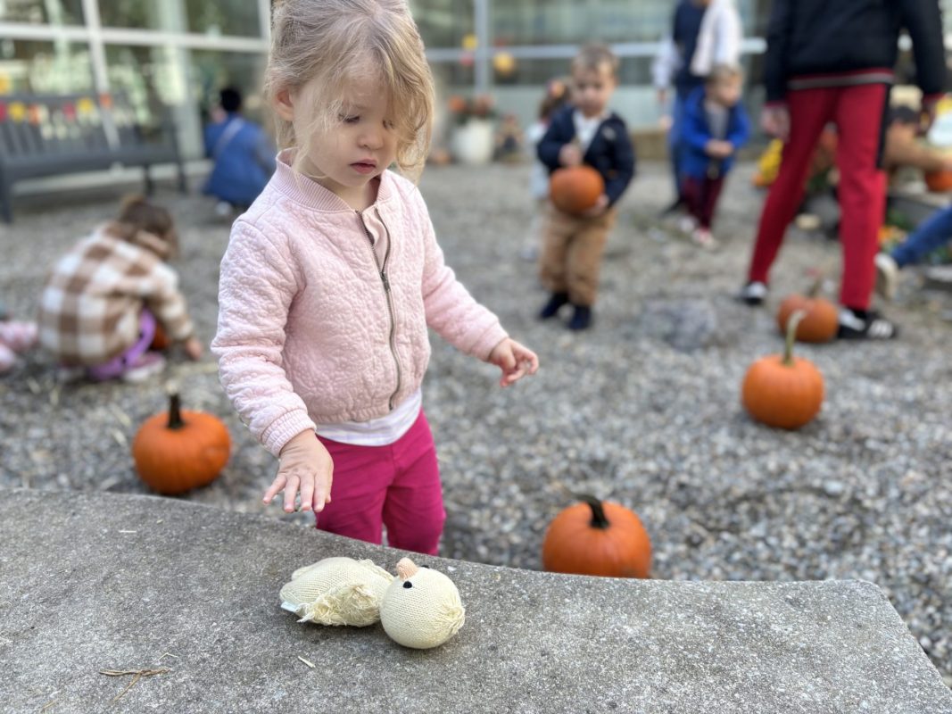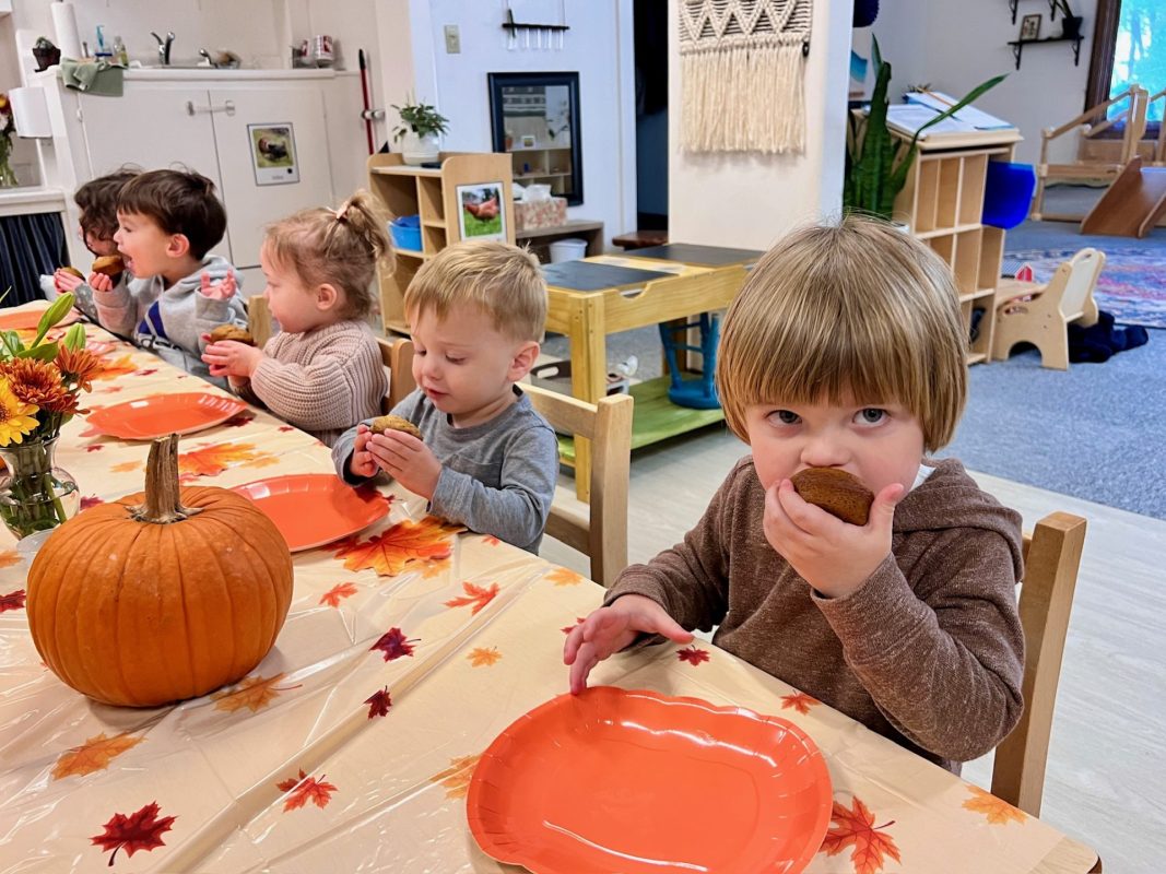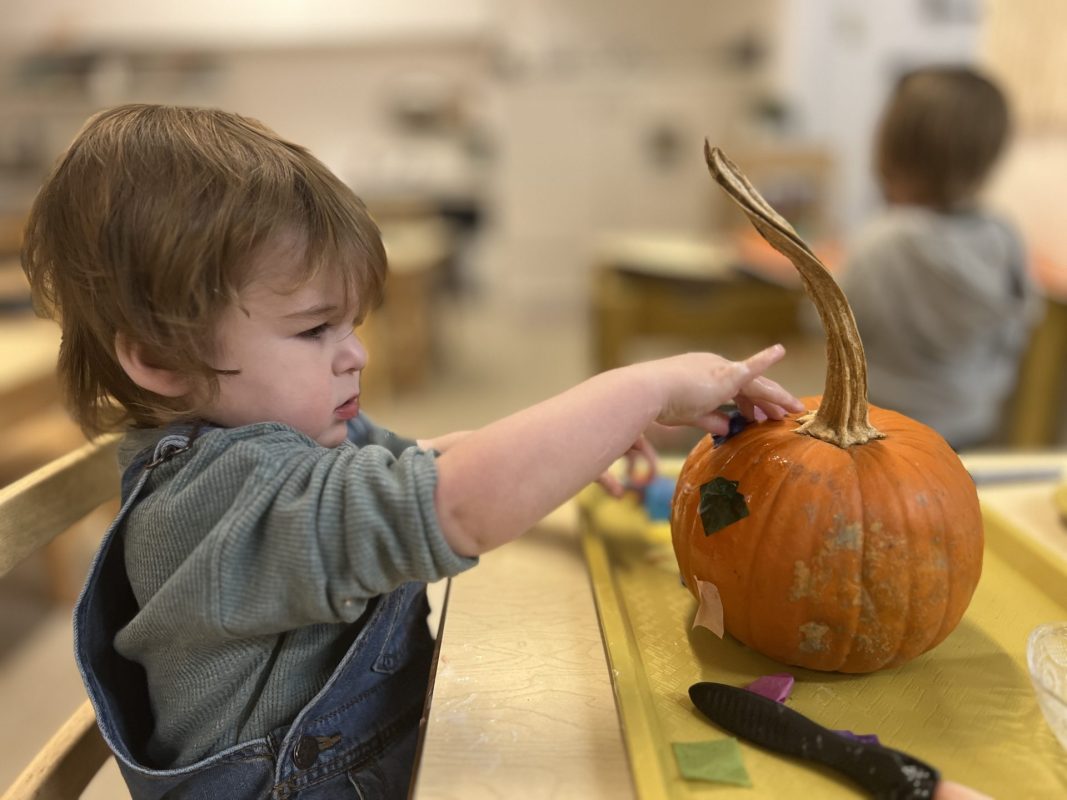 Opening a large pumpkin gave us a wonderful opportunity to explore, feel different textures, and see the inside of the pumpkin. We talked and read about the life cycle of pumpkins, how they grow, what we can do with them, and most importantly….how to cook with pumpkins! The children made pumpkin bread; each child took turns helping to incorporate ingredients, talking about each step, and enjoying working together with our hands. We took a long walk to Mr. Manuel’s kitchen to bake our bread…..the school smelled absolutely delightful! The children were amazing at practicing their patience, and we enjoyed our pumpkin bread the next day on Halloween!