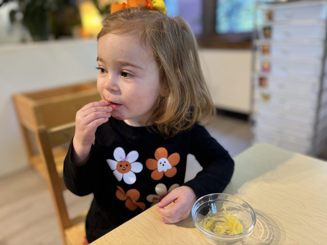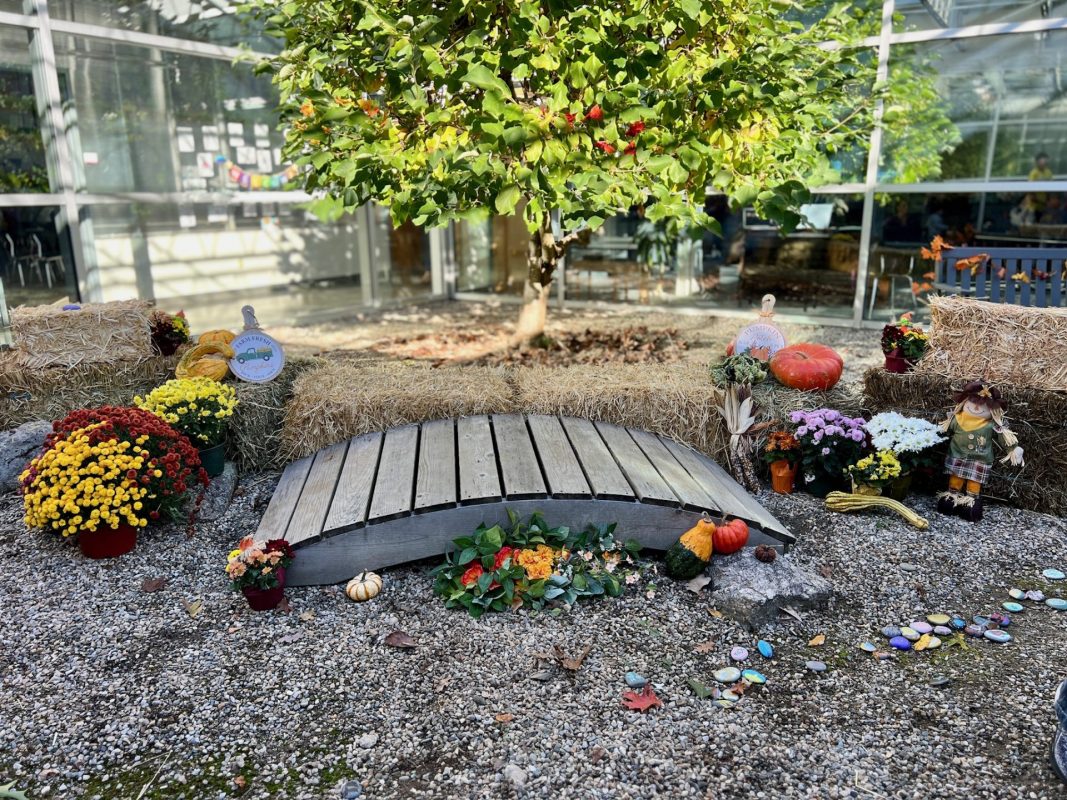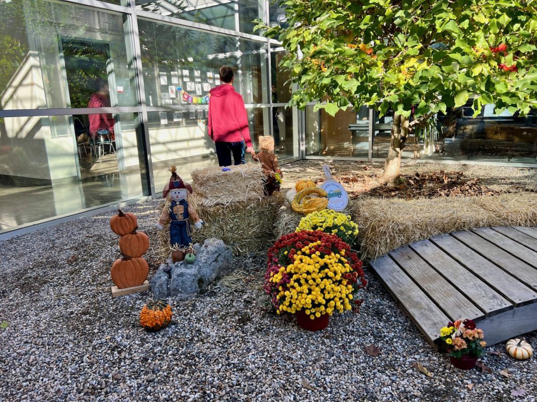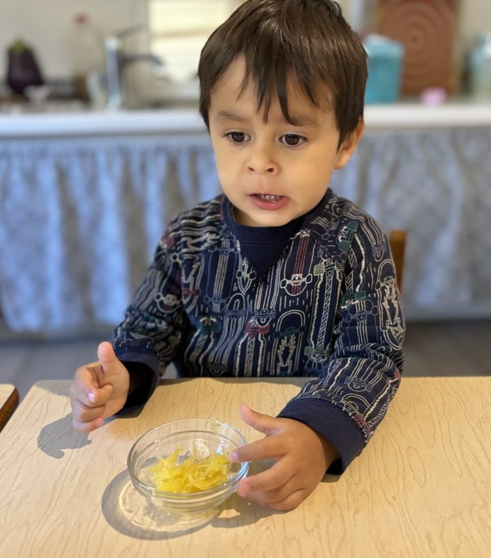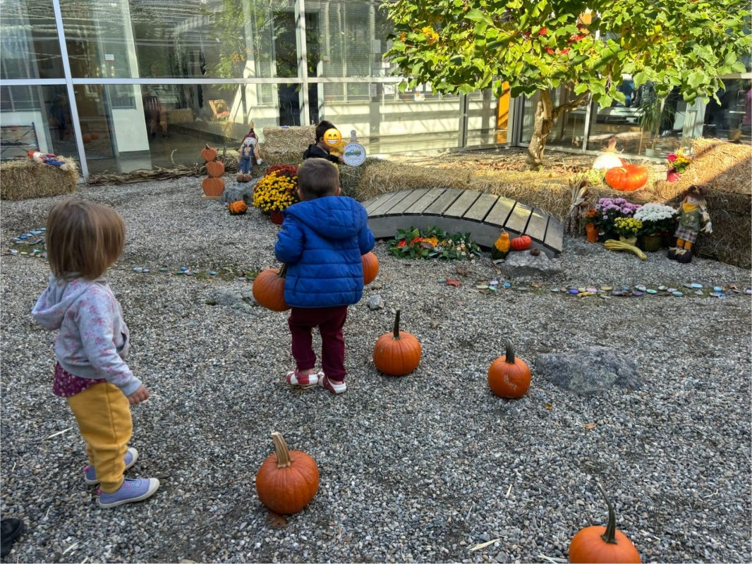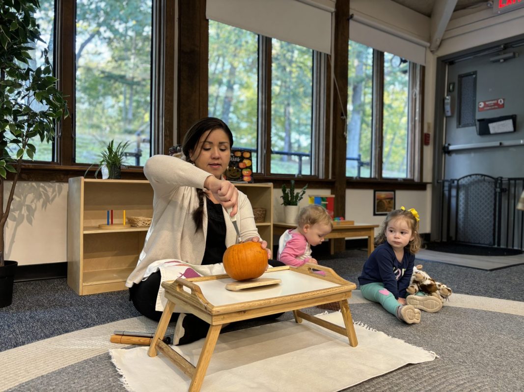 Opening a large pumpkin gave us a wonderful opportunity to explore, feel different textures, and see the inside of the pumpkin. We talked and read about the life cycle of pumpkins, how they grow, what we can do with them, and most importantly….how to cook with pumpkins! The children made pumpkin bread; each child took turns helping to incorporate ingredients, talking about each step, and enjoying working together with our hands. We took a long walk to Mr. Manuel’s kitchen to bake our bread…..the school smelled absolutely delightful! The children were amazing at practicing their patience, and we enjoyed our pumpkin bread the next day on Halloween!