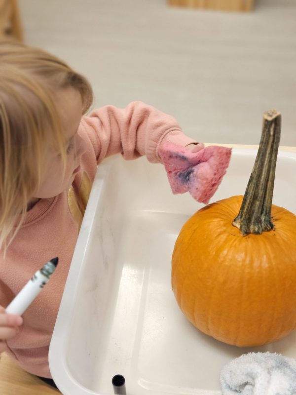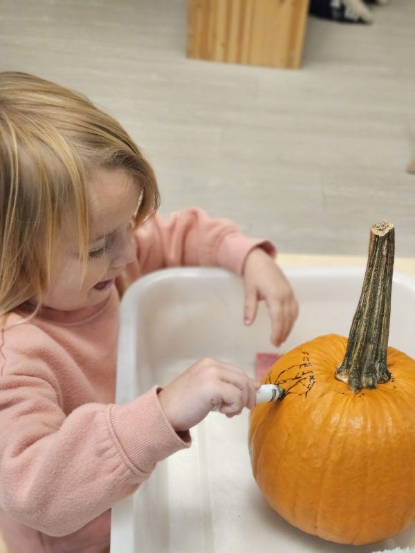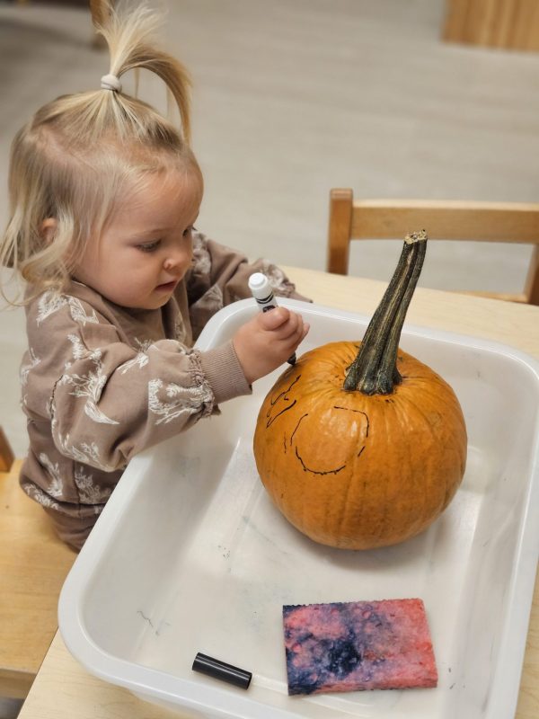We kicked things off with a pumpkin-picking adventure right here at school. Toddlers were invited to walk through our mini pumpkin patch, choosing a pumpkin of their own. It was wonderful to see the independence and pride as each child carefully selected one — big, small, bumpy, smooth — all perfect in their eyes.